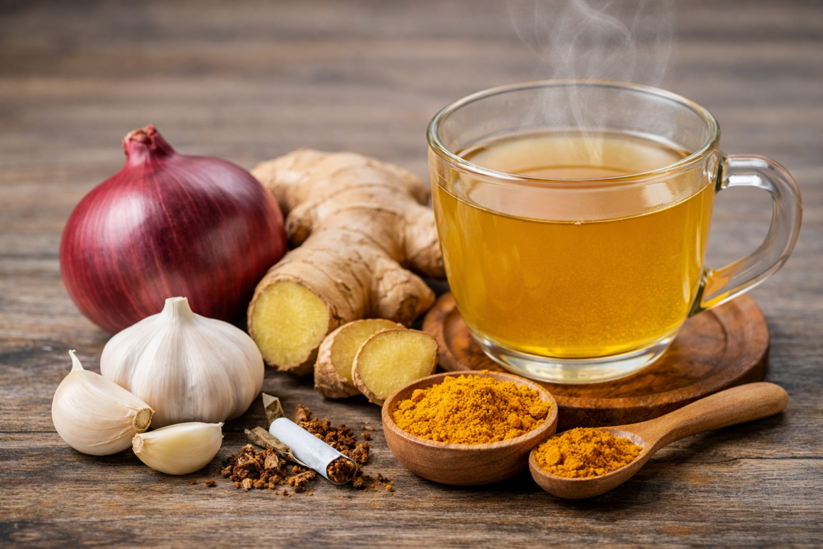 Jedan od takvih napitaka uključuje kombinaciju sastojaka poput luka, bijelog luka, kurkume i đumbira — namirnica koje su već dugo poznate u tradicionalnoj ishrani.