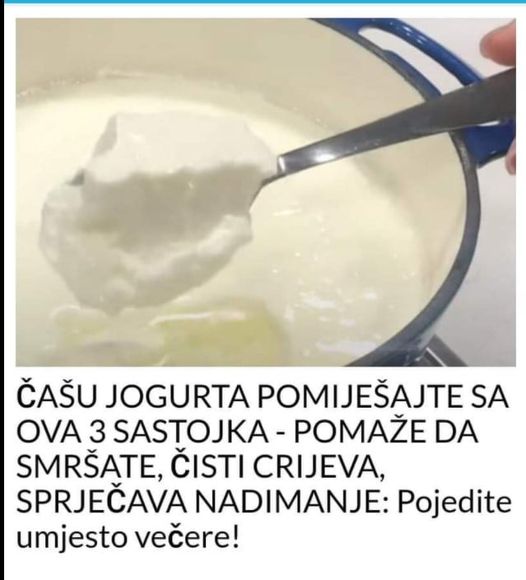 250 ml jogurta sa niskim procentom masti100 ml vode2 kašike mljevenog lanenog semena3 suve šljive1 kašika suhog grožđa