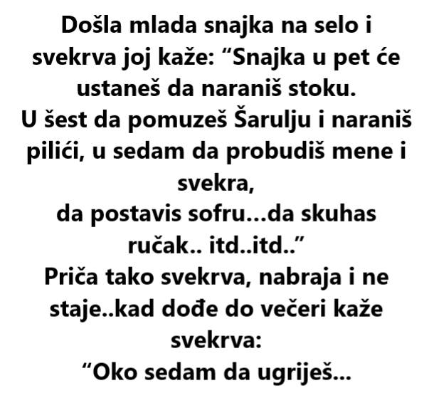 Došla mlada snajka na selo i svekrva joj kaže: “Snajka u pet će ustaneš da naraniš stoku i krmad, u šest da pomuzeš Šarulju i naraniš pilići, u sedam da probudiš mene i svekra …
