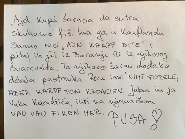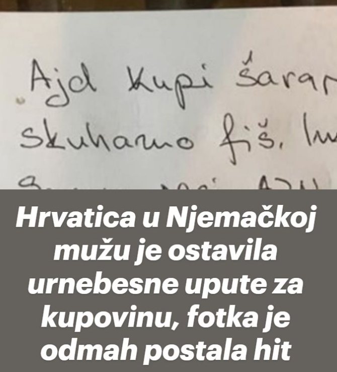 Share Facebook Twitter LinkedIn Pinterest Email Društvenim mrežama kruži fotka detaljnih uputa koje je jedna žena napisala svome mužu. Par po svemu sudeći živi i radi u Njemačkoj, a ova živopisan vodič za kupovinu hrvatskog šarana u Njemačkoj nasmijao je cijelu regiju.