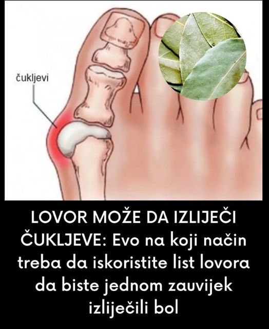 5 velikih lovorovih listova, što sitnije sameljite i prelijte sa 96% alkoholom (100 ml). Ostavite 7 dana da ostoji, nakon čega treba da procediti. Smesom mažite čukljeve ali tek nakon što ste noge dobro naparili u 3 litre tople vode sa kašikom sode bikarbone). Obrišite noge, namažite sa smesom, nazujte kraće pamučne čarape i legnite.