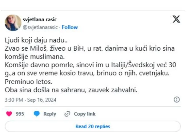 Godine su prošle. A kad je Miloš preminuo, bez pompe i pažnje, dvojica muškaraca pojavila su se na njegovoj sahrani. Sinovi onog komšije. Prešli su stotine kilometara da mu odaju poštovanje. Nisu zaboravili. Jer kako zaboraviti čovjeka koji je u vrijeme tame bio svjetlost?