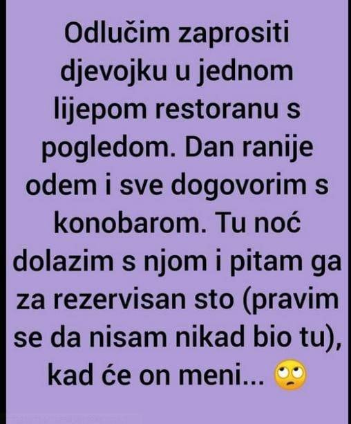 Odlučim zaprositi djevojku u jednom lijepom restoranu s pogledom. Dan ranije odem i sve dogovorim s konobarom. Tu noć dolazim s njom i pitam ga za rezervisan sto (pravim se da nisam nikad bio tu), kad će on meni…