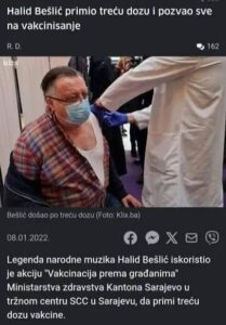 U prvoj objavi, uzeo je par slika Halida Bešlića, te dopisao da je ‘mnogo ovakvih slučajeva’, aludirajući na navodne smrtne slučajeve nakon vakcinacije. U doba COVID-19, brojne dezinformacije i teorije zavjere širile su se o štetnosti iste, koja nije naučno dokazana.