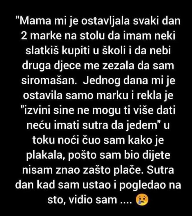 Sutra dan kad sam ustao i pogledao na sto, vidio sam kako je ostavila 4 marke, sa porukom ”voli te tvoja mama”.