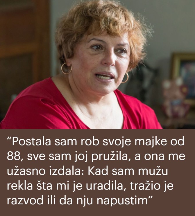 “Imam 67 godina, živim sa mužem odvojeno od majke. Ona ima 88 godina, malo hoda kada se dobro oseća – može da kuva ponešto, može da koristi telefon, sve razume, još nema demenciju. A ja živim njen život, sve sebi uskraćujem. Nabija mi ogroman osećaj krivice ukoliko je ne pozovem par sati. Obavezno svaki dan idem kod nje. Ako nešto želi, odmah trčim i radim to. I može da zove svakih 10 minuta, bilo da sam kod kuće ili na poslu, i da me pozove da joj rešim probleme. Ponekad je ujedu komarci, ponekad se oseća loše. I tražim slobodno vreme, bežim sa posla. Za svaku glupost me zove, a svako moje opravdano odbijanje pretvara u užasnu scenu. Govori mi kako joj nisam bitna i kako je posmatram kao teret.
