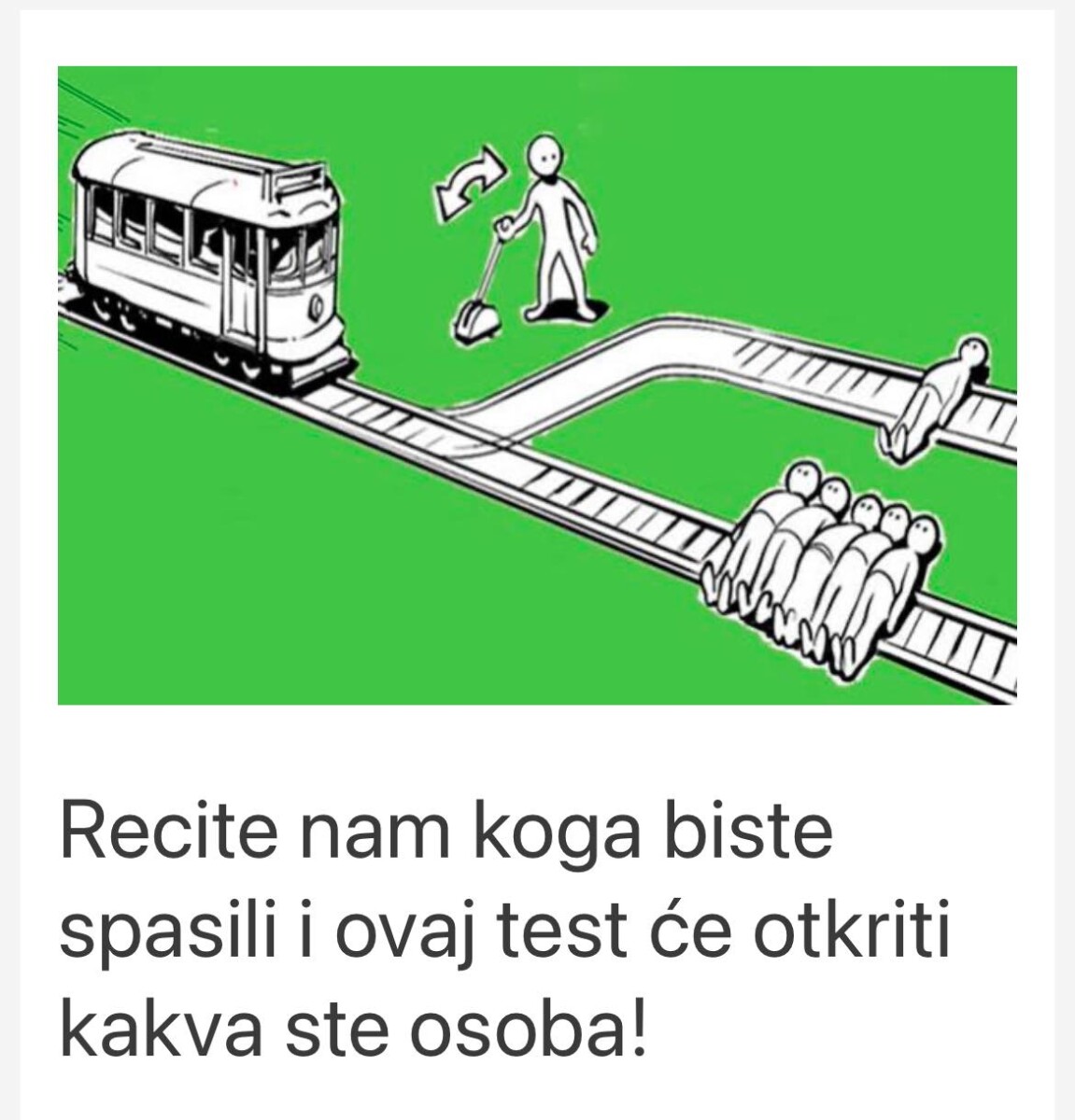 Sve što trebate učiniti je odgovoriti na pitanje koje smo postavili u vezi sa slikom koju vidite u ovom virusnom testu. Koga bi spasio? Imate moć promijeniti rutu vlaka jer je na jednoj tračnici grupa od 5 ljudi, a na drugoj samo jedna.