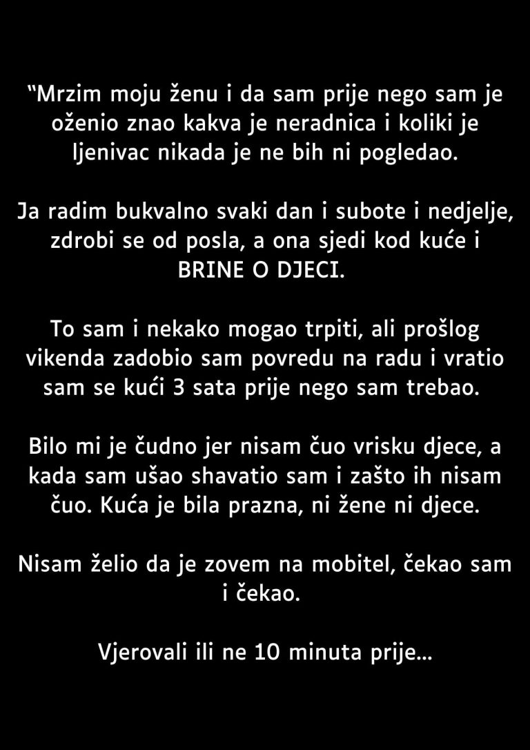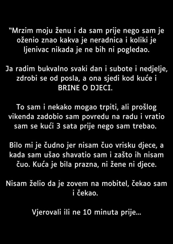 To sam i nekako mogao trpiti, ali prošlog vikenda zadobio sam povredu na radu i vratio sam se kući 3 sata prije nego sam trebao. Bilo mi je čudno jer nisam čuo vrisku djece, a kada sam ušao shavatio sam i zašto ih nisam čuo. Kuća je bila prazna, ni žene ni djece.