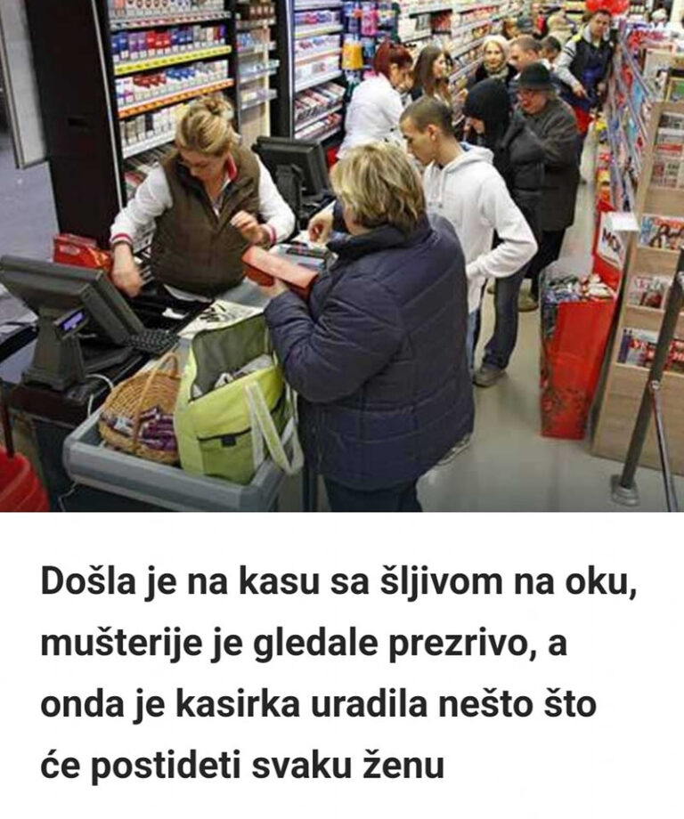 Skrušena žena je došla na kasu, bezuspešno skrivajući veliku ljubičastu masnicu na levom oku, čekajući red da plati. Iza nje se čulo mrmljanje dveju žena: