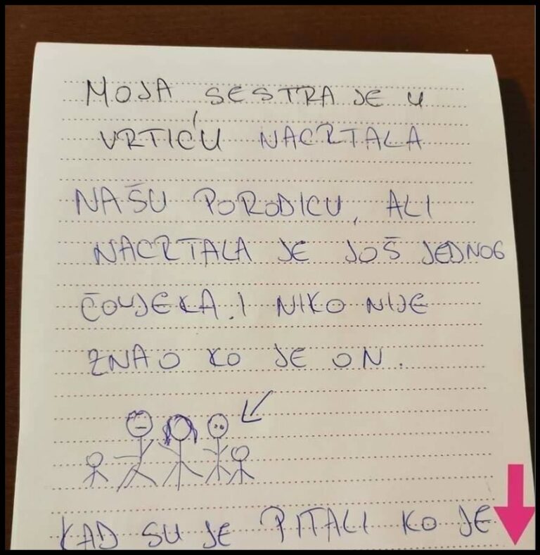 Share Facebook Twitter LinkedIn Pinterest Email MOJA SESTRA JE U VRTIĆU NACRTALA NAŠU PORODICU, ali nacrtala je i NEPOZNATOG ČOVJEKA Kad je teta pitala ko je on, sestra je dala hit odgovor