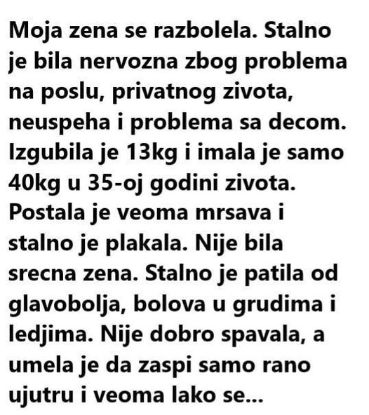 “Moja zena se razbolela. Stalno je bila nervozna zbog problema na poslu, privatnog zivota, neuspeha i problema sa decom. Izgubila je 13kg i imala je samo 40kg u 35-oj godini zivota. Postala je veoma mrsava i stalno je plakala. Nije bila srecna zena. Stalno je patila od glavobolja, bolova u grudima i ledjima. Nije dobro spavala, a umela je da zaspi samo rano ujutru i veoma lako se zamarala.