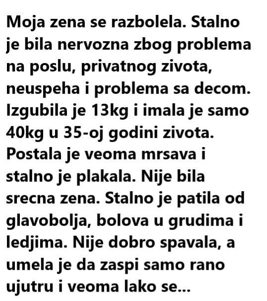“Moja zena se razbolela. Stalno je bila nervozna zbog problema na poslu, privatnog zivota, neuspeha i problema sa decom. Izgubila je 13kg i imala je samo 40kg u 35-oj godini zivota. Postala je veoma mrsava i stalno je plakala. Nije bila srecna zena. Stalno je patila od glavobolja, bolova u grudima i ledjima. Nije dobro spavala, a umela je da zaspi samo rano ujutru i veoma lako se zamarala.