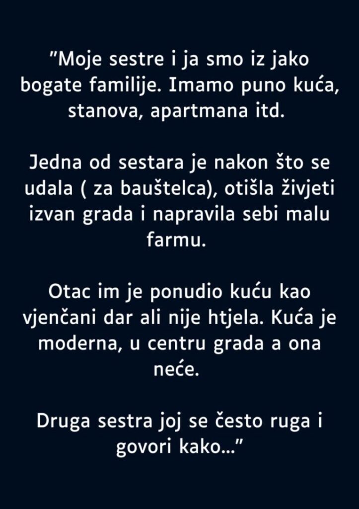 “Moje sestre i ja smo iz jako bogate familije. Imamo puno kuća, stanova, apartmana itd. Jedna od sestara je nakon što se udala ( za bauštelca), otišla živjeti izvan grada i napravila sebi malu farmu.
