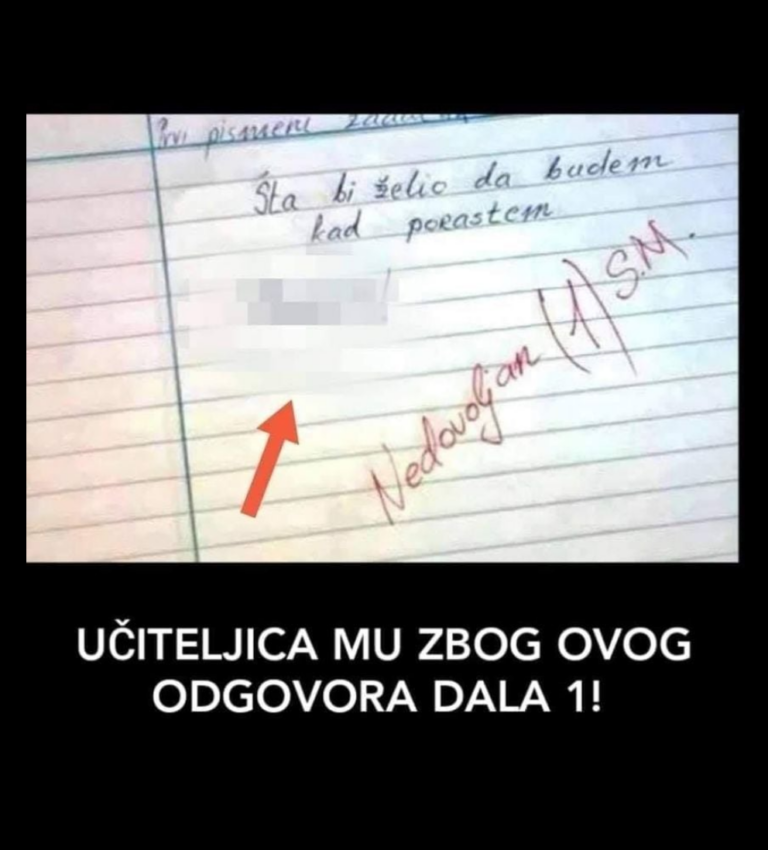NA PITANJE “ŠTA BI ŽELIO DA BUDEM KAD PORASTEM”, DJEČAK JE NAPISAO SAMO OVU RIJEČ: Učiteljica mu odmah dala 1