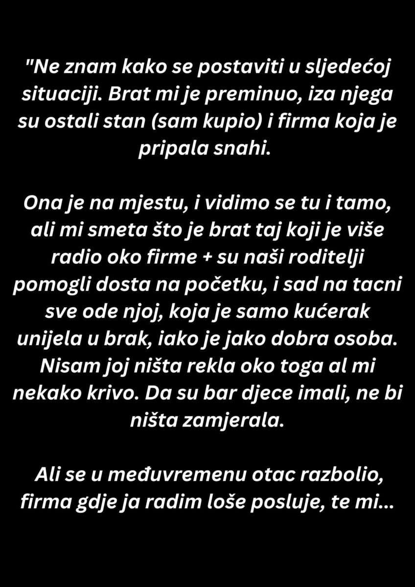 “Ne znam kako se postaviti u sljedećoj situaciji. Brat mi je preminuo, iza njega su ostali stan (sam kupio) i firma koja je pripala snahi. Ona je na mjestu, i vidimo se tu i tamo, ali mi smeta što je brat taj koji je više radio oko firme + su naši roditelji pomogli dosta na početku, i sad na tacni sve ode njoj, koja je samo kućerak unijela u brak, iako je jako dobra osoba. Nisam joj ništa rekla oko toga al mi nekako krivo. Da su bar djece imali, ne bi ništa zamjerala.
