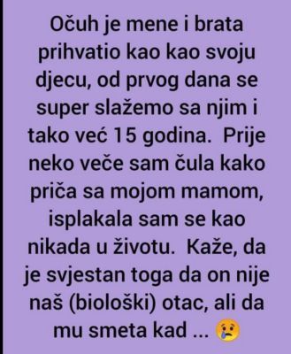 Prije neko veče sam čula kako priča sa mojom mamom, isplakala sam se kao nikada u životu. Kaže, da je svjestan toga da on nije naš (biološki) otac, ali da mu smeta kad ga ljudi podsećaju na to.