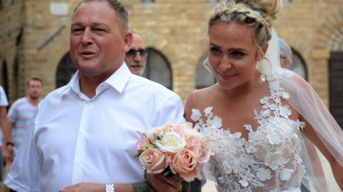 “U crkvi menjaju raspored kuda cu ući jer me auto nije dovezao pred ulaz kuda je bilo lakše proći sa mojom ogromnom haljinom, pa smo išli uz stepenice, tata i ja. Ljudi se ne sklanjaju s puta, osetim da mi tu i tamo zakače haljinu cipelama, dolazim pred njega. Čini mi se kao da se ponovo zaljubljujem u njegove velike zelene oči dok mi se to sve još uvek čini nestvarnim, možda i njemu, ko zna. Odvode nas prvo da se obavi formalnost oko potpisa, zatim se venčanje nastavlja. Ljudi se guraju, moji se teško snalaze, mesta u prvom redu namenjena za njih su im zauzeli drugi, oni stoje do mene, tati nije dobro, on opet odbija da sedne. Od stajanja ni sama više noge ne osetim, od vrućine i oznojenih ruku prsten mi spada s ruke, devojčica koja mi je držala haljinu mi ga dodaje. Ceremonija se završava, moji mi žele prići i čestitati, niko ne prilazi, svi izlaze napolje i opet gužva oko mene, čuvam haljinu koliko mogu, izlazimo. Onda dolazi riža. Svekrva je podelila kilu riže koju su svi koji su prišli da čestitaju kada smo izašli, bacili na nas”, napisala je Snježana u objavi.